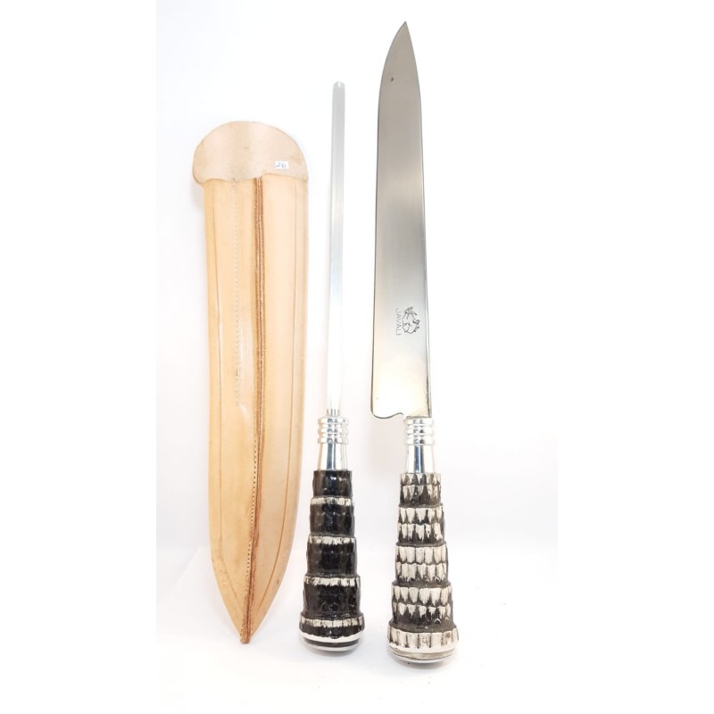 Conjunto de cuchillo artesanal hoja de 26cm con chaira y vaina de cuero