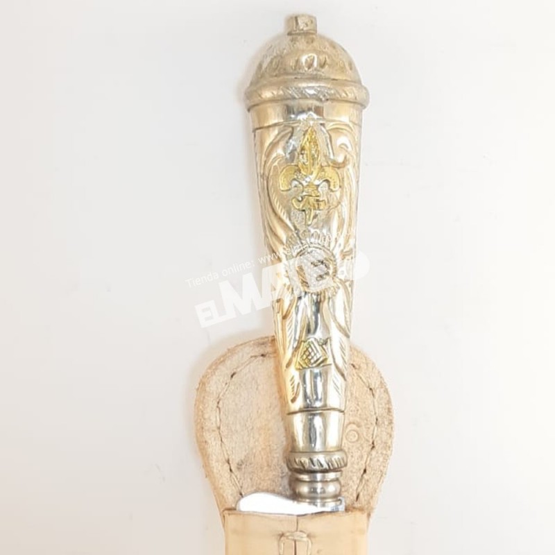 Cuchillo artesanal criollo mango redondo en plata con apliques en oro.